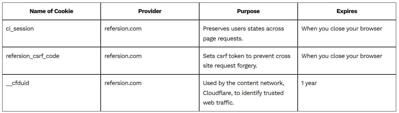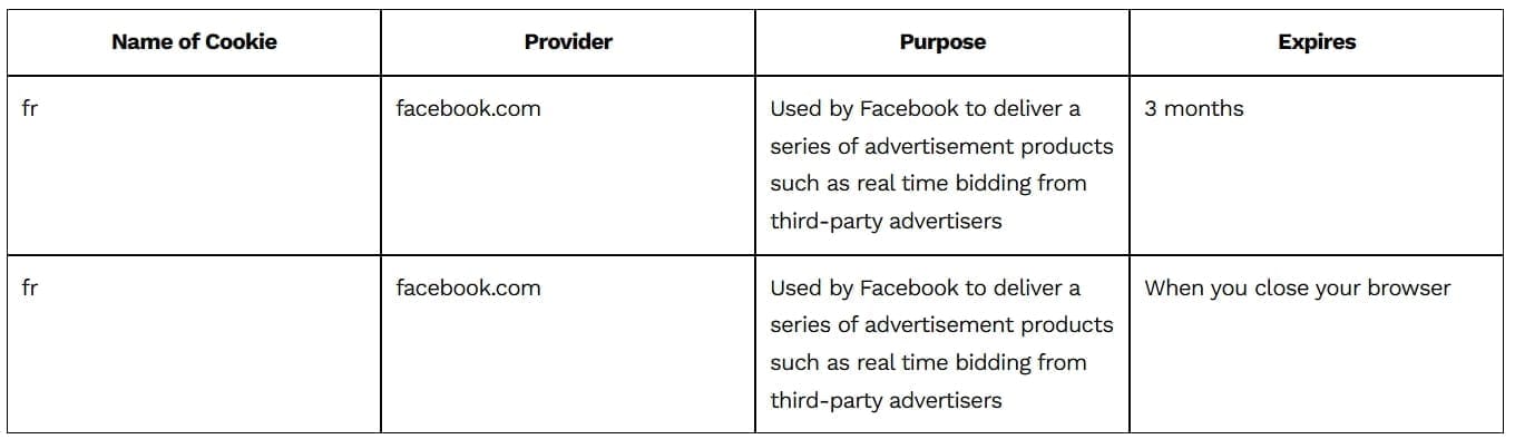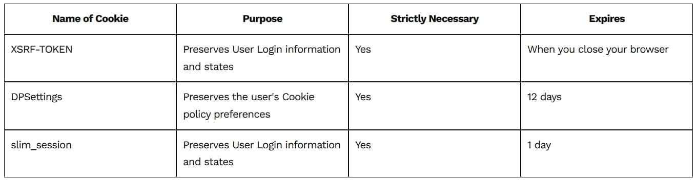 3.4 Cookies on Our Site are not permanent and will expire as indicated in the table below.