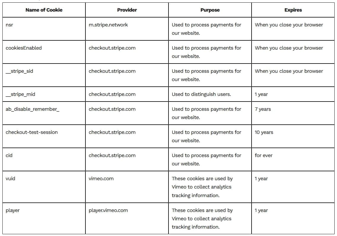 4.2 The following strictly necessary third-party Cookies may be placed on your computer or device (remove stripe cookies from the list if you don’t use stripe):