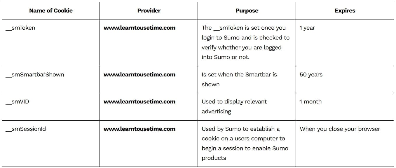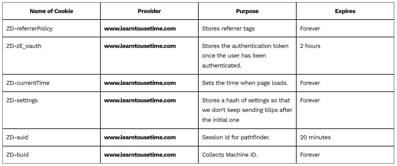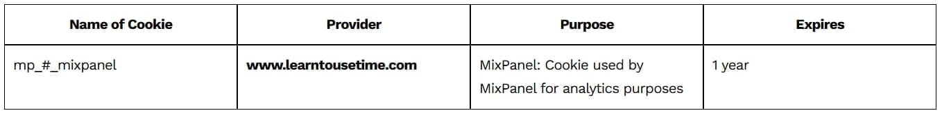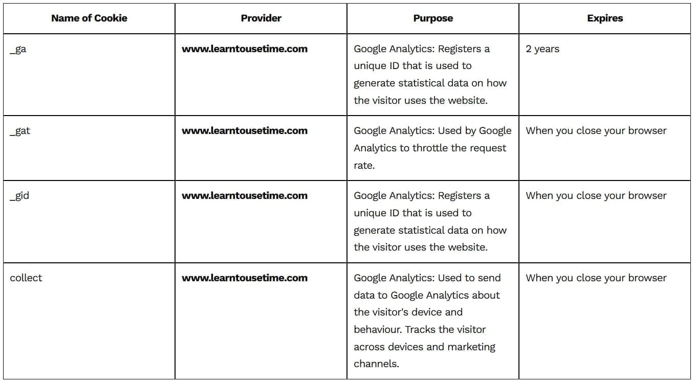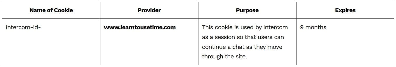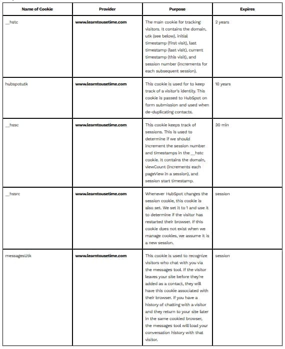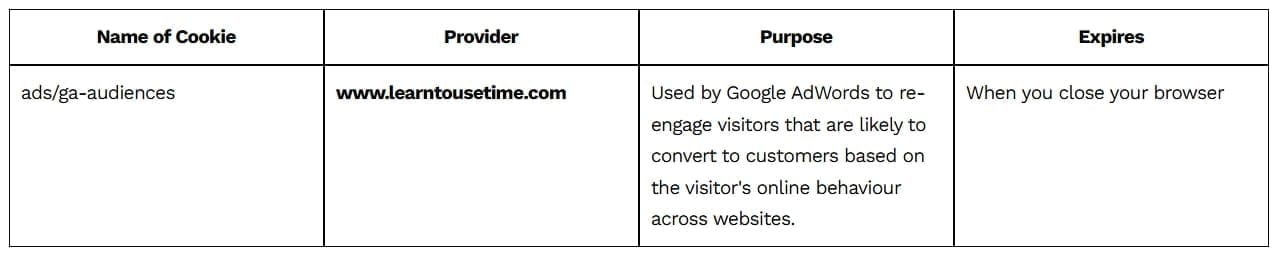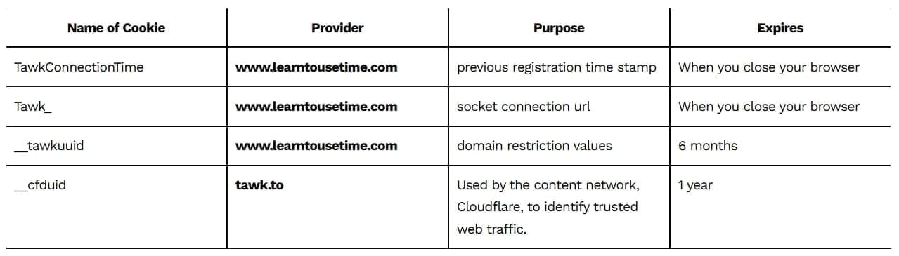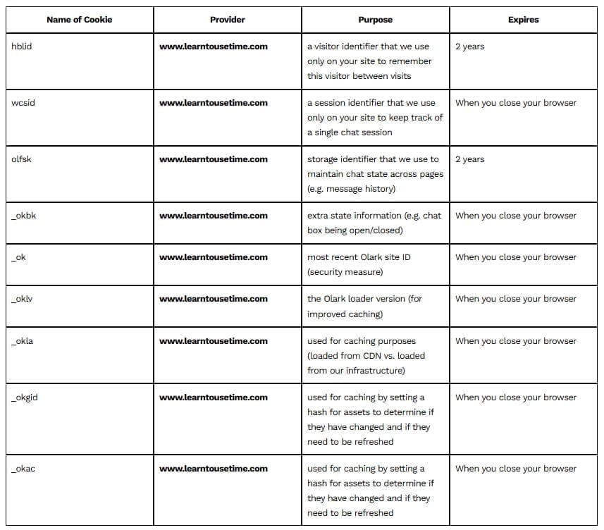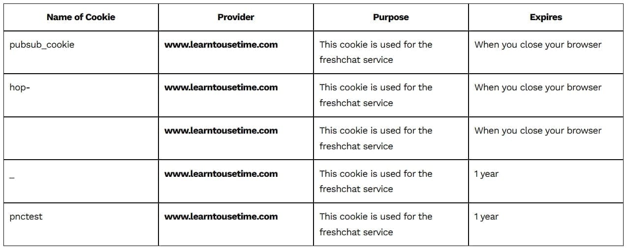 7.1 If you would like to know more about how We use Cookies, please contact Us at support@learntousetime.com.