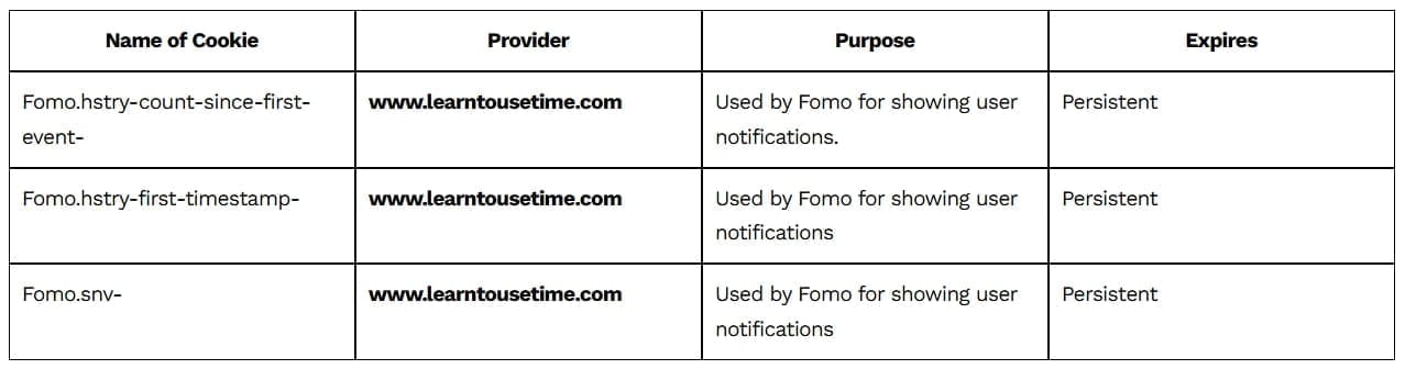 This website www.learntousetime.com uses Cookies and similar technologies in order to distinguish you from other users. By using Cookies, We are able to provide you with a better experience and to improve Our Site by better understanding how you use it. Please read this Cookie Policy carefully and ensure that you understand it. Your acceptance of Our Cookie Policy is deemed to occur when you press the “accept” button on Our Cookie banner or when you have selected your preferred Cookie options in Our Cookie manager and pressed the “Continue” button. If you do not agree to Our Cookie Policy, please stop using Our Site immediately.